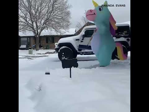 Mom Dressed Like a Unicorn costume to enjoy working with snow in winters.